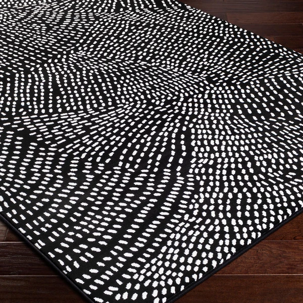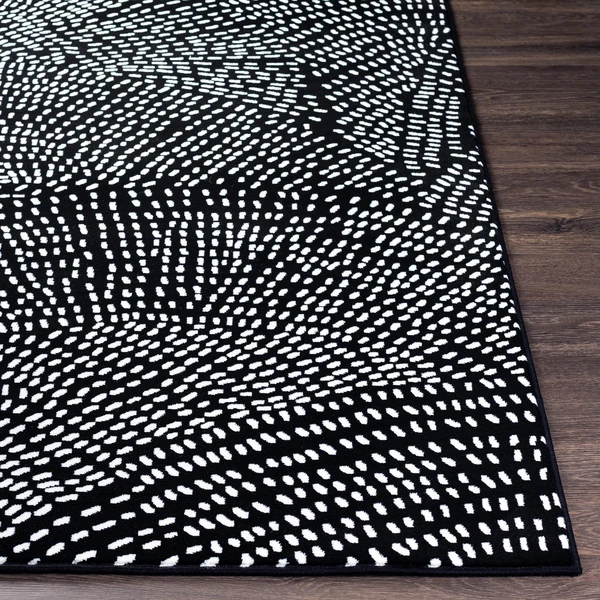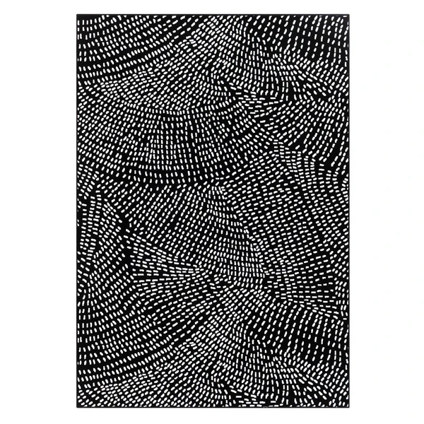 This rug enlivens any space with its swirled dash design in white on a black ground.
