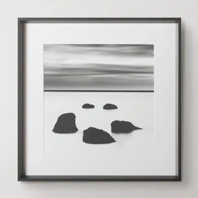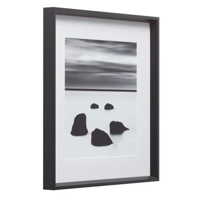 - Print set under glass with a white mat and solid wood frame with a black finish