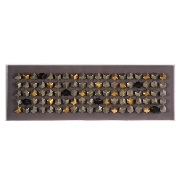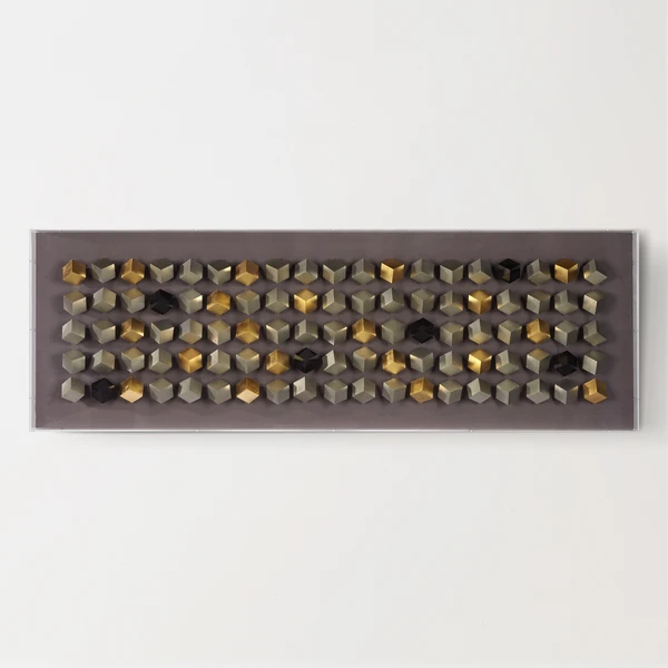 It’s your one way ticket to midnight…call it heavy metal!” Set in a shadowbox frame, this work makes an immediate impact on the wall with its cubic, dimensional design and tri-tone metallic finish.