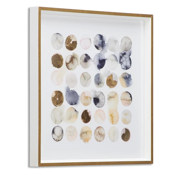 • Giclee print on fine art paper with hand applied gold leaf accents. Set under glass in a solid wood frame with a gold and white finish.