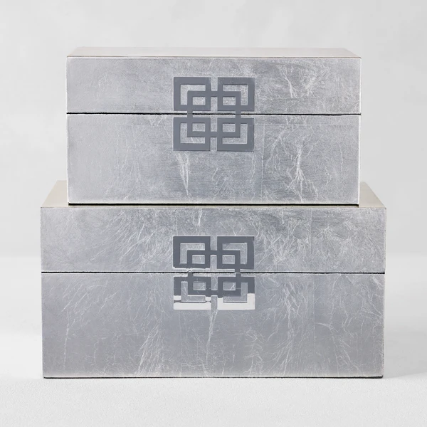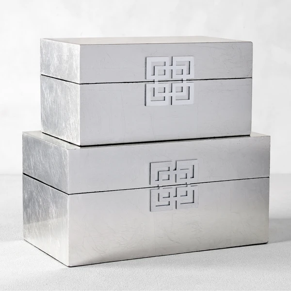 Storage so stylish that it dare not be relegated to the closet. Our Ming Storage Boxes are designed exclusively for Z Gallerie, with a focus on utility but an eye on fashion for your home. These sturdy wooden boxes are richly covered in a silver leafing, providing a lustrous metallic hue. The lids are finished with a decorative geometric medallion and metal hinges at the back.