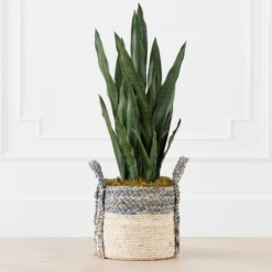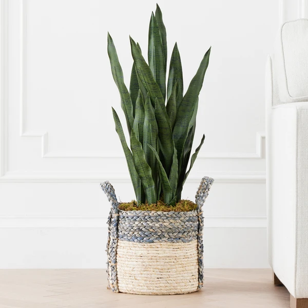 A visually stunning and stately faux arrangement featuring Mother in Law’s Tongue in a woven blue and tan basket.