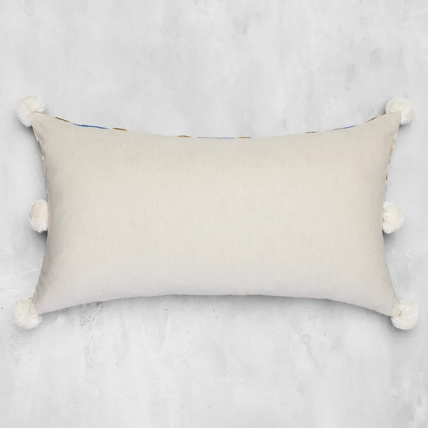 Protect yourself and your guests from unwanted energy. Nikki Chu’s Evil Eye lumbar pillow captures superstition and whimsy in one piece. The front is printed and accented with embroidery in gold metallic thread while the sides are adorned with oversized pom-poms. This throw pillow measures 14″ x 26″ and is a Z Gallerie exclusive. Removable insert included.