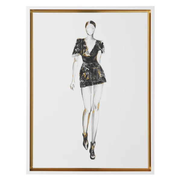 Small-scale in stature, but big on style, the On The Runway Series makes a fashion statement for sure. Each piece is created using giclee on canvas with a hand-applied image brush gel finish. They are framed in white floater frames with gold inner framing. On The Runway XI is #2 of 4 in a series.