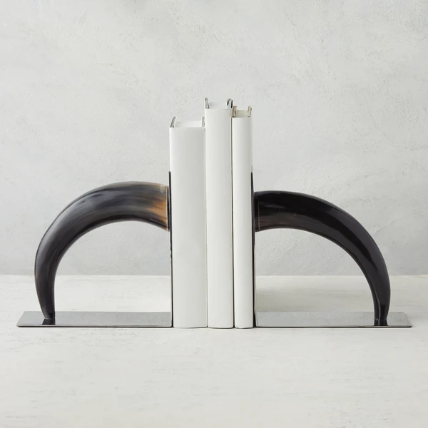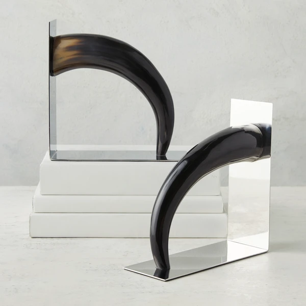 Pairing steel and horn, these bookends add a sleek and naturally luxurious accent to a desk or shelf.