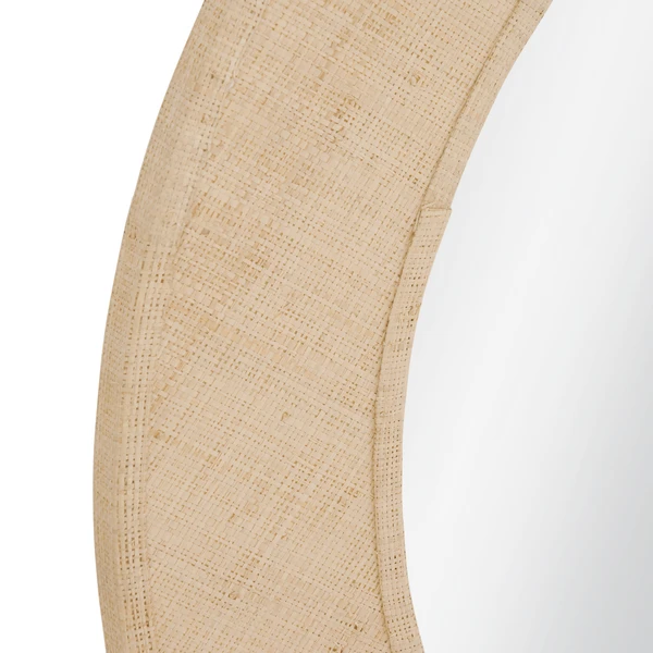 Our Shyr Mirror is round and features a natural raffia wrap. The hand crafted details produced by a skilled artist lends itself to a unique technique and will vary slightly.
