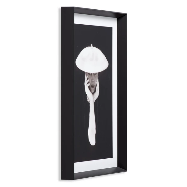 A glamorous portrait in black and white, this giclée print is displayed under glass in a matte black frame.